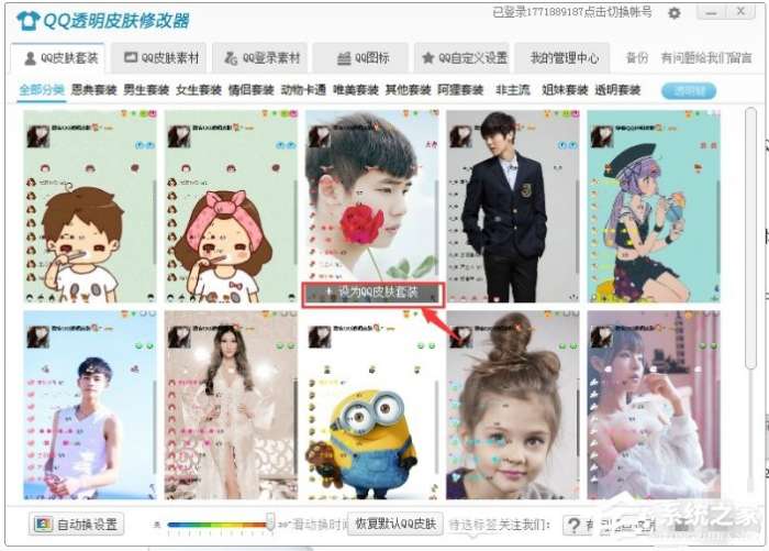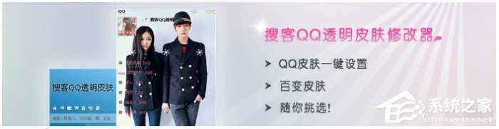 1、退出QQ,点一下软件界面上的“设为QQ皮肤套装”按钮,可以一键修改成你喜欢的明星的QQ透明皮肤了。修改器会对需要注意的地方进行提示,一般提示都点击确定。