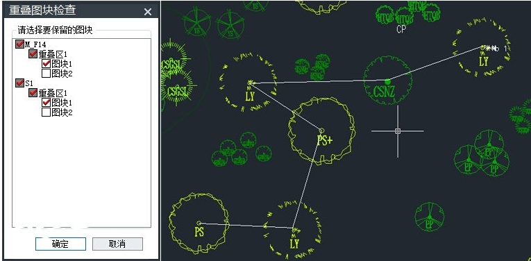 7.乔灌重叠检查:检查图面上是否有重叠的乔灌图块,如果有则弹出对话框可以查看删除重叠的块