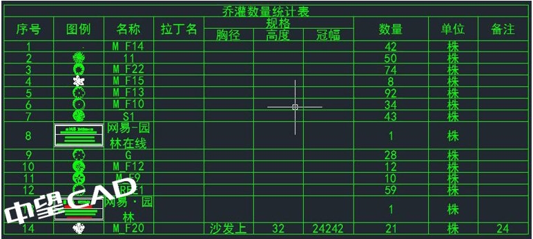 12.苗木数量统计表:选择乔灌所在的区域,自动生成苗木数量统计表