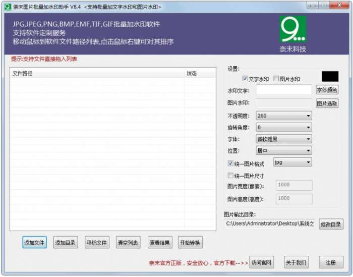 奈末照片批量加水印小助手是一款能够协助客户将图片文件批量加水印的软件工具,适用JPG,JPEG,PNG,BMP,EMF,TIF,GIF等图片文本文档。支持添加文件夹,支持直接拖入文件到软件列表中。支持添加文字水印和图片水印,一键转换,简单易用,绿色软件,解压即可用,无需安装。软件非常实用,JPG批量加水印软件,PNG批量加水印软件,BMP批量加水印软件。