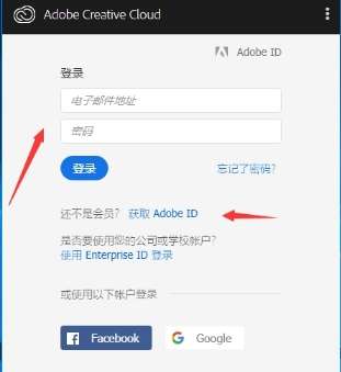 3.安装完成之后,软件会自动打开,如果你的电脑是第一次安装adobe软件,那么他会提示你登录你的Adobe账号,如果没有账号可以点击获取adobeid进行注册一个。有账号登录之后就可以进入PS界面。