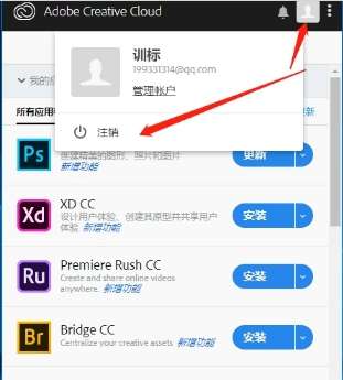 5.在永久注册之前,我们必须要先注销adobeid账号,就是adobe creative cloud云商店的账号。必须注销掉,这个一定要切记。我们打开cloud之后,点击右上角的头像,出现注销两个字,我们点击注销掉就可以了。