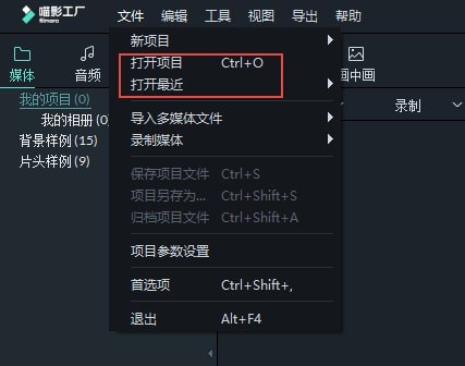 启动喵影工厂时,您最近的项目将显示在项目库中。在编辑界面中,还可以选择“文件”下的“打开最近”来查找项目。
