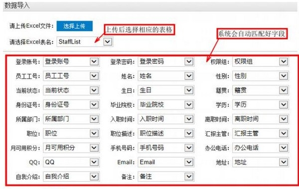 3、填写好后,在员工档案界面,当“导入”按钮,并上传EXCEL文件,系统会自动匹配字段,完成后点确定进行导入,导入成功后,会提示成功导入。