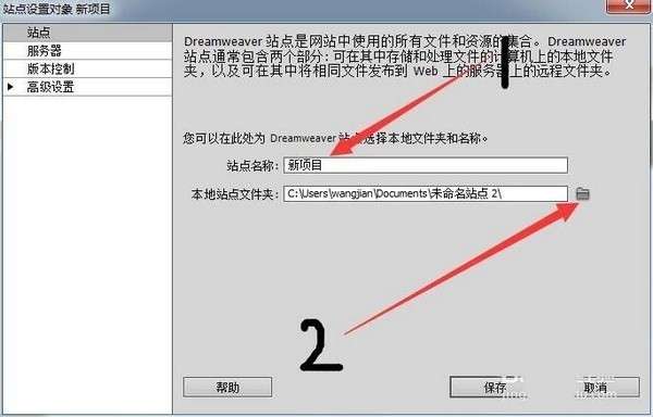 2、然后会弹出一个对话框,我们给这个站点取一个名字,然后下面点击后面的文件夹图标找到项目所在的文件夹。