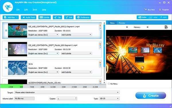 nyMP4 Blu-ray Creator 允许你可以自由的添加字幕、音轨,并可以利用内置的精美模版来制作编辑编辑精美专业的蓝光视频光盘的菜单和界面!支持显卡硬件GPU加速,并对NVIDIA® CUDA™, AMD APP Acceleration, Intel® Quick Sync Video Tech等进行了优化!