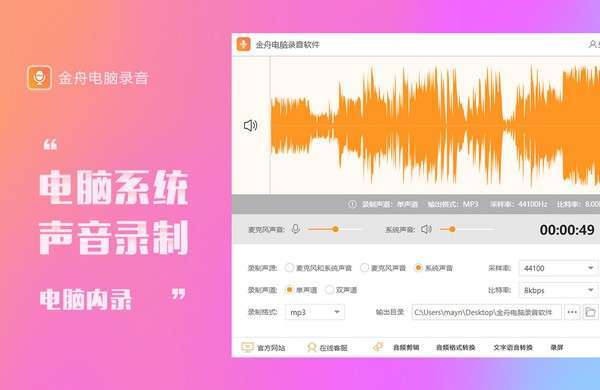 金舟电脑录音软件最新版是款适合电脑中使用的录音工具,支持单独录音、混合录音、多音频格式录音、定时录音模式、键盘按键快速录音等操作,并金舟电脑录音软件还可以支持输出为MP3,WMA,AC3,FLAC,WAV,M4A,OGG等格式保存。