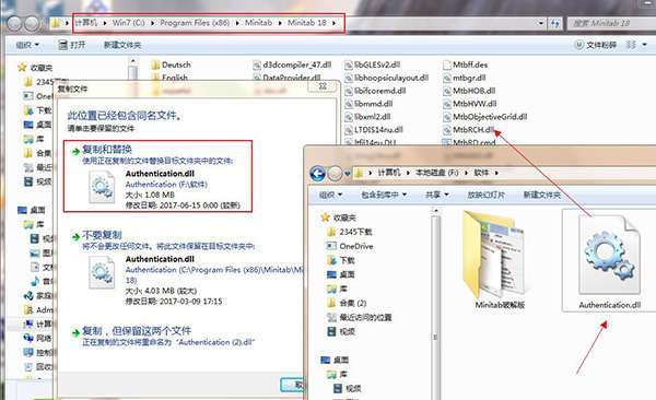 3、将数据包中的破解补丁Authentication.dll复制到上一步打开的文件目录下替换原文件。