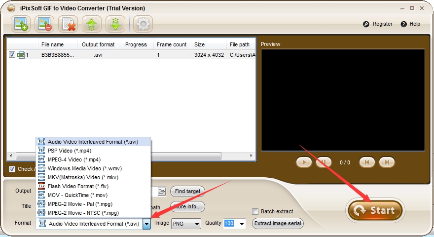 最后,选择您喜欢的视频输出格式,然后单击“Start”按钮开始转换。