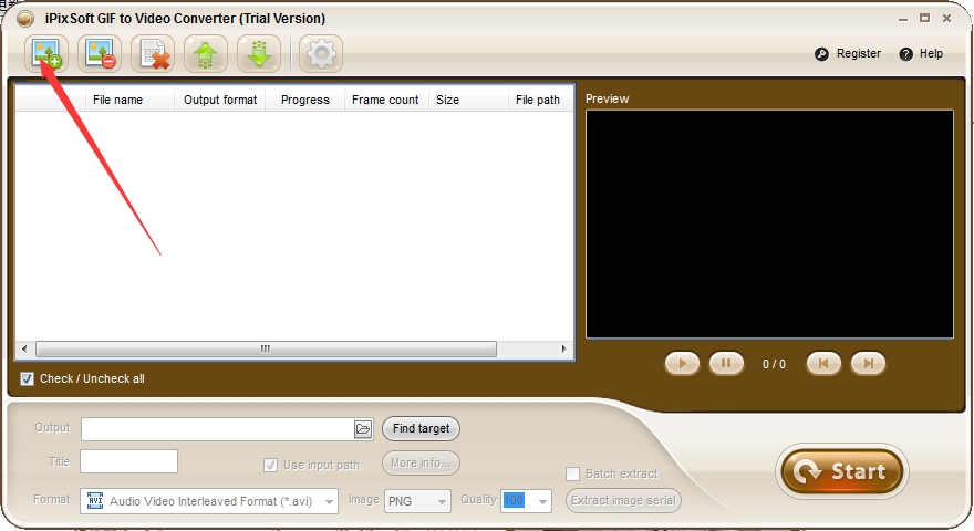 安装后打开软件,点击图示按钮导入要转换为视频格式文件的GIF图像文件。