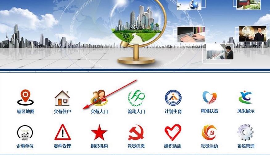 9、当然了,久龙社区网格化服务管理信息平台的功能还有很多,主页有十四个功能,可以选择实有住户、流动人口、案件受理、组织机构、党员信息等功能