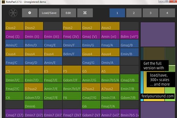 2、打开XotoPad。点击数字按钮在不同的页面之间切换。点击“加载/保存”,你会看到另一个视图,你可以加载音阶,和弦,推子等。