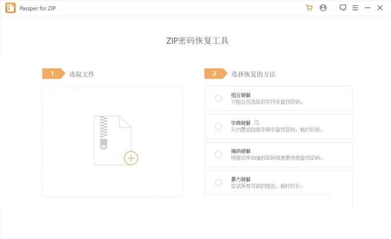 使用这个简单直观的应用程序为您提供四种解密方法,以恢复您的ZIP档案的密码。