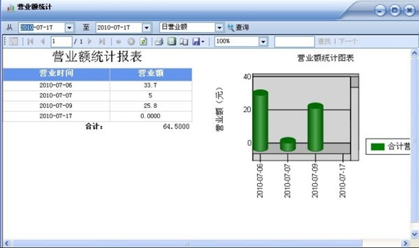 在导航菜单上点击【统计分析】按钮,则可查看相应的统计报表,在此以【营业额统计】分例,如下图所示: