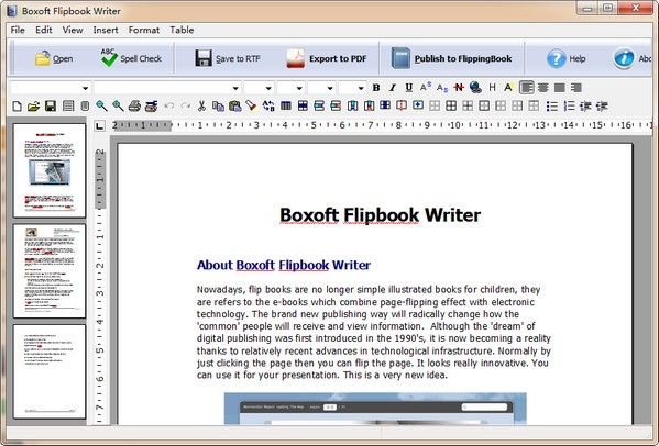 是一款十分好用的翻页电子书制作软件,它可以让你直接进行文字处理,旨在帮助你创建或编辑翻页书,如果你想编写电子书、翻页书、数字目录的话可以使用它来进行使用的,同时你还能够根据需要将文件导出为RTF或PDF文件,并且还能够直接将其发布到具有翻页效果的翻页书中,在你将它发布到翻页书上后,你就能够将它发布到网络上然后就可以通过电子邮件与公众分享了,也可以将它发布到CD-ROM上哦,同时软件操作十分的简单,即可没有使用过的人也能快速上手哦,喜欢的话来下载Boxoft Flipbook Writer最新版开始使用吧。