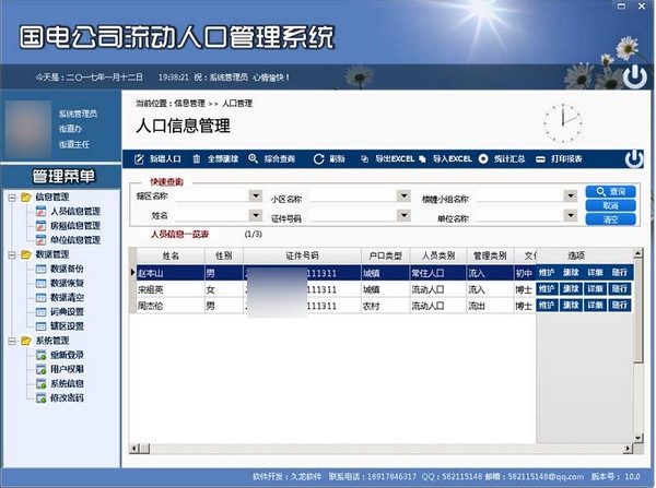 1 流动人口信息管理:对辖区流动人员的基本信息、居住信息、工作信息、计生信息、随行人员等的管理,信息采集除手工录入外,可以使用身份证读卡器功能自动读取人员信息,可以使用视频拍照、屏幕截图功能采集人员照片。自动生成“流动人员信息登记表”、“暂住证”等报表。