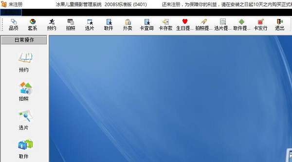 冰果儿童摄影管理系统最新版是一款儿童摄影经营管理软件。冰果儿童摄影管理系统最新版包含了品项管理、套系管理、预约登记、客户信息、折扣管理、拍照管理、选片管理、取件管理、外卖管理、流水管理、卡查询、卡存款等主要功能。冰果儿童摄影管理系统可以随时备份系统中的数据。