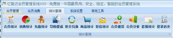 6.统计查询包括会员统计、消费统计、充值统计、导购提出、积分兑换、商品统计、短信统计、会员分析等选项,如图: