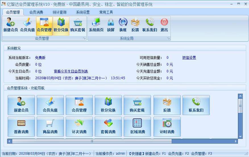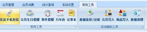 3.主界面包括会员管理、会员消费、统计查询、系统设置、常用工具等选项,如图: