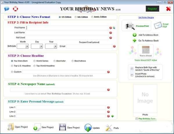 使用屏幕底部的按钮,您可以打开已保存的项目,创建新项目,保存项目,通过电子邮件发送新闻页,检查软件和数据库更新,或设置首选项。检查播放生日调整框将播放一点生日快乐调整以增强时刻。取消选中该框以停止它,或单击关闭按钮。