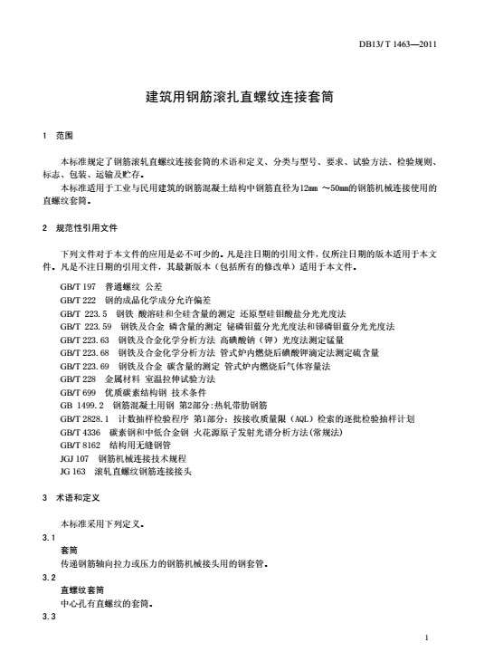 DB13/T1463-2011规范是一份关于建筑用钢筋滚扎直螺纹连接套筒的专业规范文档,其中详细的介绍了各种专业术语和定义标准等,非常详实,可供工程设计人员参考使用,欢迎来体验阅读。