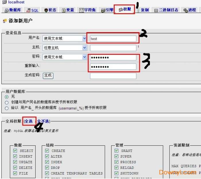 4、做完了上面的配置之后,我们需要给mysql数据库创建一个用户以及用户对应的数据库,同样,点击右上方的权限按钮,找到中间偏下面的一个“添加新用户”链接,按照图示的方法创建一个用户以及对应的数据库,并赋予单个数据库管理权限,下面的资源限制则是按照实际情况填写就可以了,一般自用的情况下那个区域是可以保留默认的,最后再点击右下角的“执行”按钮,相应的用户以及数据库就创建好了。