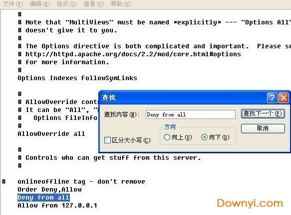 2、继续搜索,找到如图所示的两个地方(分别在大约第190行和第225行),分别把“allowoverridenone”改成“allowoverrideall”(这一步操作是针对使用了url重写功能的朋友,如果没有用到的话这步建议不要做修改,因为改了这个之后apache的安全性会略微有所下降。)