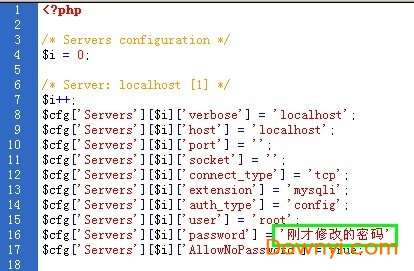 是因为刚才我们修改了mysql的密码,但是没有修改phpmyadmin与mysql通讯的密码,怎么改呢?打开wampserver安装目录,然后依次打开\wamp\apps\phpmyadmin3.3.9,用记事本或者dw软件打开里面的config.inc.php,找到“$cfg['servers'][$i]['password']='';”,在最后的两个单引号里面输入刚才修改的那个密码,然后保存,操作完毕之后再刷新一下phpmyadmin的页面,是不是恢复正常了呢?
