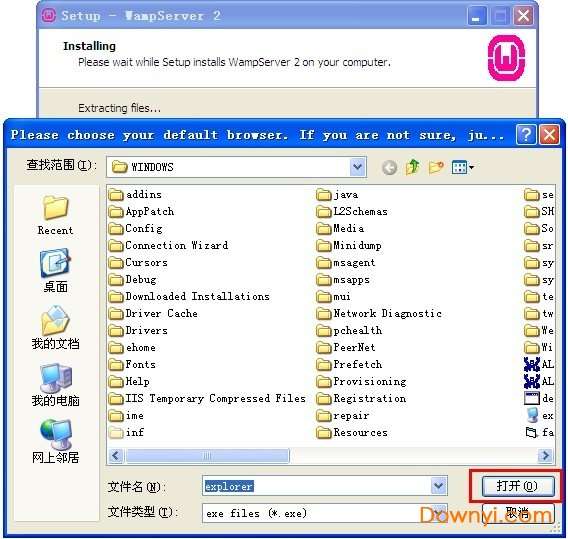2、上图为选择默认浏览工具:安装过程中会提示要选择默认浏览工具,如上图所示,不过要注意哦,这个浏览工具指的可不是浏览器哦,它指的是windows的浏览器,也就是explorer.exe,默认的就是这个,直接点击“打开”就可以了。