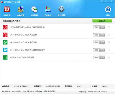 定时关机3000修改版功能强大,简单易用,他可以〖定时自动关机〗+〖计划任务〗+〖禁止上网聊天〗+〖禁止运行你设定的软件(如游戏)〗+〖禁止浏览网页〗+〖禁止在指定的时间段使用计算机〗+〖禁止在指定的时间段上网〗。