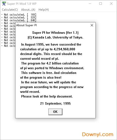 super pi是一款专用于检测cpu稳定性的软件,软件通过计算圆周率让cpu高负荷运作,以达到考验cpu计算能力与稳定性的作用。该软件的使用很简单,下载运行后,单击软件主界面“计算”菜单,软件将弹出对话框让你选择要计算的圆周率位数,计算的位数越多,检测时间越长,对cpu的考验也越大。通常一般情况下可以选择104万位的运算,如果要求较高则可以选择419万位的运算。如果cpu能够在最高的3355万位的检测中通过,则该cpu将能够在非常苛刻的环境下稳定运行。