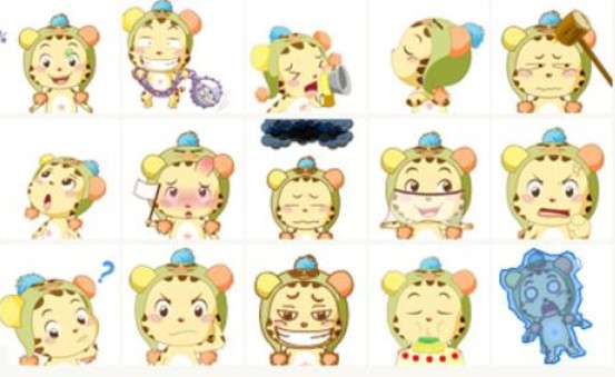 一只超萌的小老虎,表情有:玩剌猥,结冻,被垃圾砸倒,唱歌,不屑,玩刀,敬礼,雷击,练功,BYE……,学僵尸,呲牙,敲木鱼,疑问,训斥,投降,滑板,过生日,喊话,戴纱,装死中,天女散花,打,HI……。