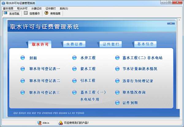 取水许可与征费管理系统电脑版是款专门为了从事用水行政主管部门研发设计的管理工具,取水许可与征费管理系统电脑版内置实用的功能,其软件主要用于日常水资源工作的管理,取水许可与征费管理系统为广大用户提供了基本信息录入、取水许可、水费征收和证件套打四个功能模块,可以满足用户的需要。