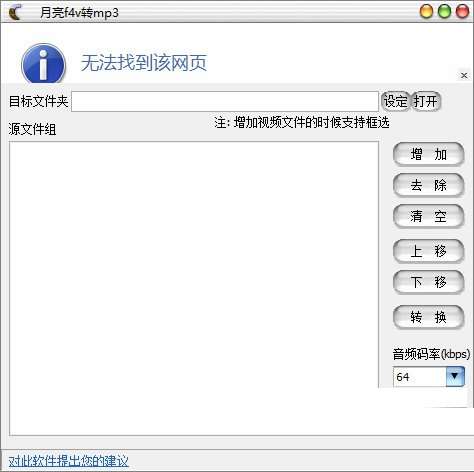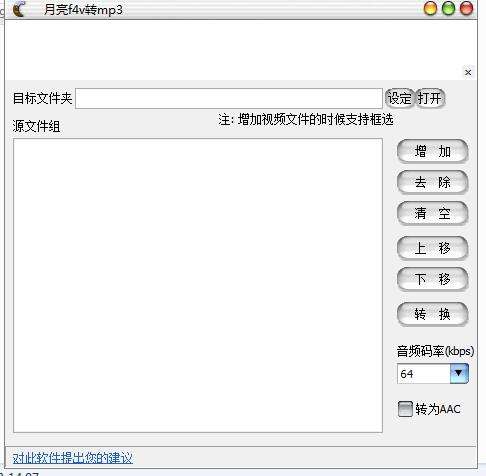 小编推荐:月亮f4v转mp3工具 是一款不错的音频转换软件,感兴趣的同学快下载使用吧,相信你一定会喜欢上的。mp3转m4r、音频转换软件、wma转mp3、amr播放器、歌曲格式转换也是不错的软件,推荐同学们下载使用。