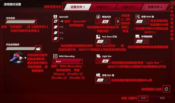 点击右上角【】进入【游戏模式设置】页面。一共可以保存4组设置。更改设置并点击【保存】后,后续在软件主界面点击文件名称如【设置文件1】,将执行对应设置。