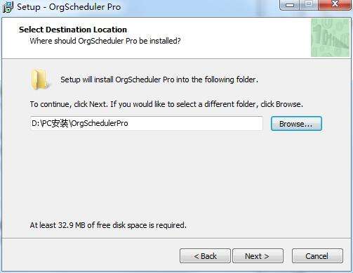 3、选择安装位置,用户可以选择,默认的C:Program Files (x86)OrgBusinessOrgSchedulerPro,也可以自定义(记住安装位置,便于破解)。