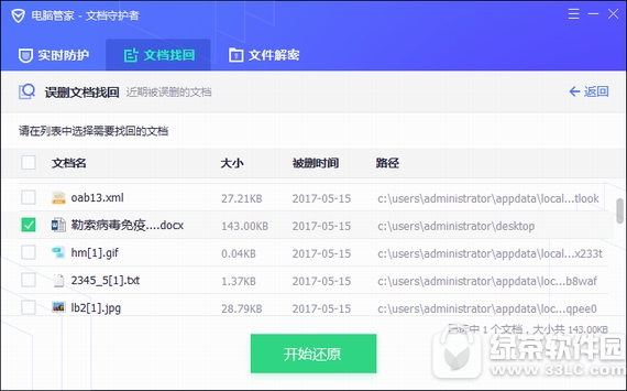 当某个文档不小心被误删除了,可以打开误删文档找回功能,此时文件列表会出现近期被删除的文档,找到您想要的文件勾选后,点击开始还原,再选择一个置顶的导出路径,点击确认还原就搞定啦!
