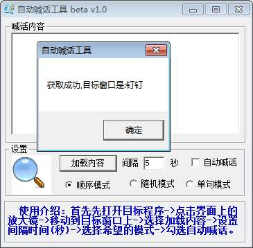 2:打开目标程序,以钉钉为例,将放大镜移动到标题处会提示获取成功的提示(提示:需要设置按enter键发送消息)