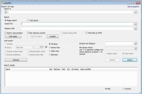 2、一旦启动,grepWin允许您自定义搜索或替换在许多方面。