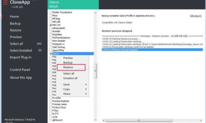 4.软件备份完成。就可以尝试使用CloneApp的还原功能将软件还原。鼠标右键点击CloneApp软件列表中的软件,在展开菜单中点击restore,就可以将该软件进行还原。