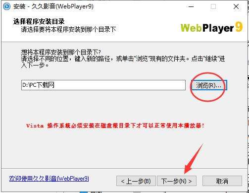 2.软件默认安装位置为“C:WebPlayer9”,小编建议点击“浏览”选择C盘以外的磁盘安装,选择好位置后点击“下一步”开始安装