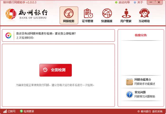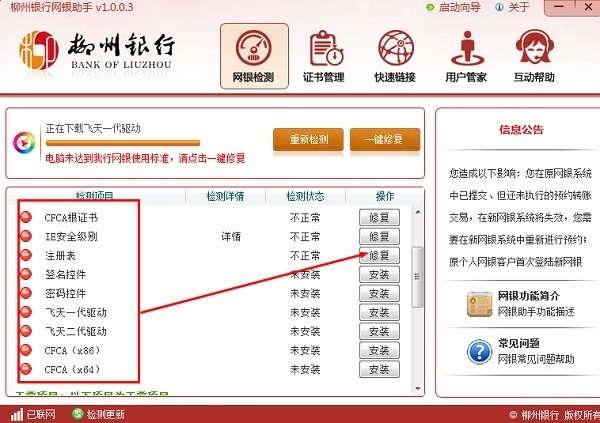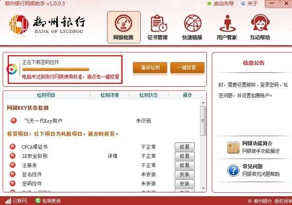 1、网银检测:对客户环境进行检测及一键修复,确保客户能正常使用网上银行