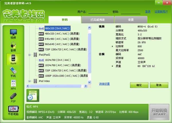一款专业的视频转换软件,能将常见的电脑视频格式,转换成MP4、AVI、PMP、3GP等设备所需要的格式。完美者转码专门针对苹果的iPhone、iPod,索尼的PSP游戏机以及各种智能手机设计,一步转换出所需的影片,支持双核、4核CPU,保证转换速度达到最快,影片体积最小,在所有转换器中效果最佳。真是想看什么,就转什么,让你随时随地体验影音的乐趣。