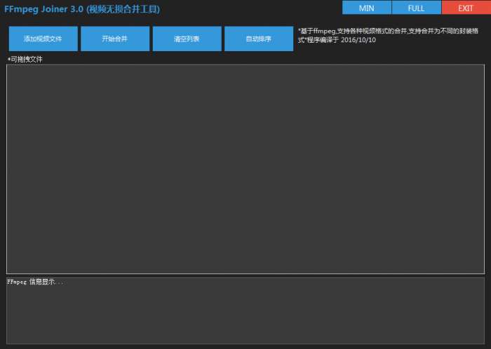 FFmpegJoiner(视频无损合并工具)官方版是一款可以对视频进行无损合并的强大软件。FFmpegJoiner(视频无损合并工具)最新版以对目前所有视频格式进行无损合并,而且不影响视频的清晰度。FFmpegJoiner(视频无损合并工具)官方版还支持自动排序功能,可以安装拖动的视频文件时间进行排序。