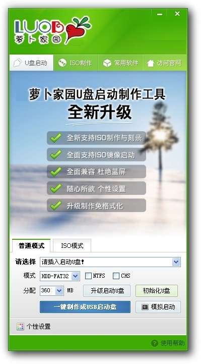 萝卜家园u盘启动盘制作工具是目前唯一能让用户下载设置自己喜欢的首页的U盘工具,是最快捷方便的U盘安装系统的工具,她适用于多种品牌的U盘,用户反馈均予以各种好评,便捷的操作方式,一键制作启动U盘。真正是一款人人都会用U盘安装系统的好工具,无需教就会用u盘装xp系统,用u盘安装win7系统;并且支持各种电脑机型及系统。