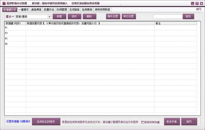 高效职场办公助理有多种方便用户使用的功能,比如桌面便笺、日程安排、倒计时闹钟、高效时间管理功能,还有众多其他强大功能让用户轻松把握互联网动态,让你的商务生活井然有序。高效职场办公助理提供众多一键傻瓜式操作,一键淘宝、一键百度、一键翻译等让用户轻松的进行需要的工作,即使用户不是办公人员,也可以利用软件轻松进行电脑操作,让自己用更简单的方式完成对计算机操作的需求。