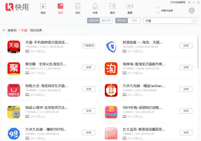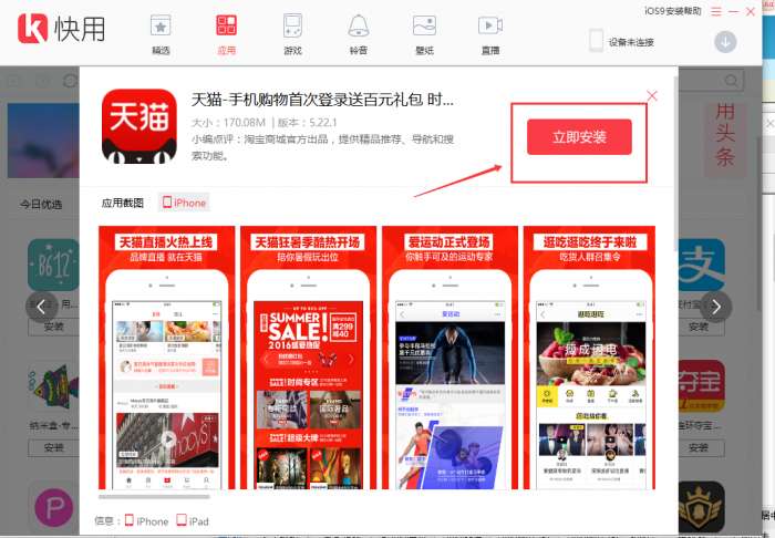 二是点击上方的应用,如果见到符合自己要求的软件,如“天猫”,点击图标出现悬浮框,点击安装下载。