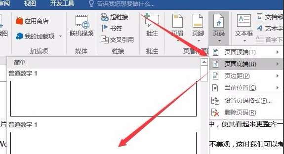 2、点击插入【页码】选项。在弹出的的选择中选择【页面底端】和样式。您可以自行选择。