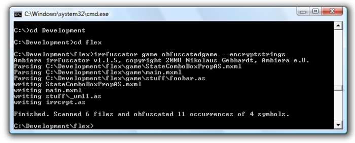 irrFuscator带有一个完整的命令行工具,它可以很容易地集成到IDE构建环境比如Flex Builder预处理步骤中,使用脚本,蚂蚁,makefile