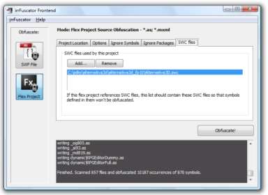 IrrFuscator可以在.as和.mxml文件的目录中读取,处理它们并将它们输出到目标目录中。只要用模糊文件重新编译目录,.swf文件就安全多了。